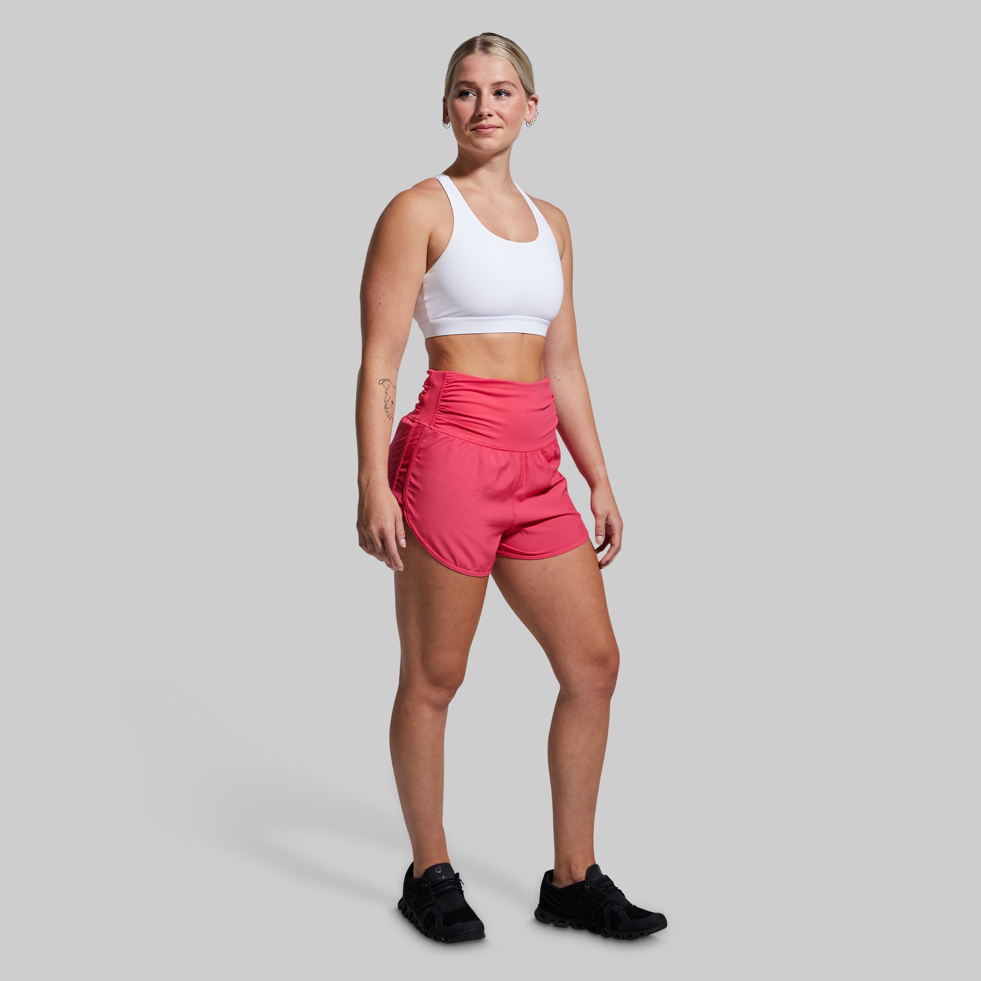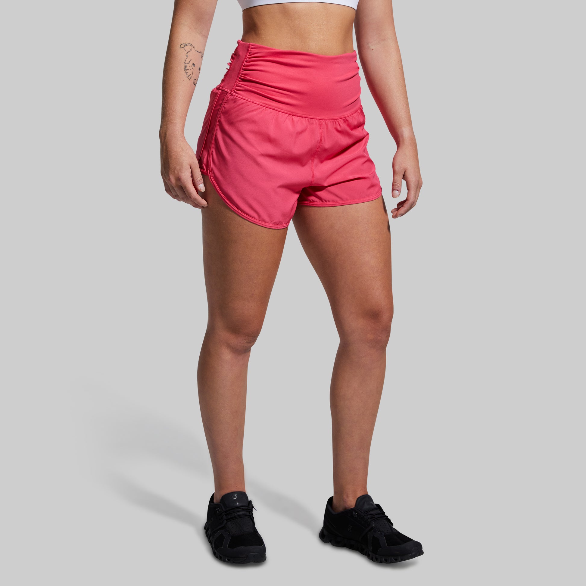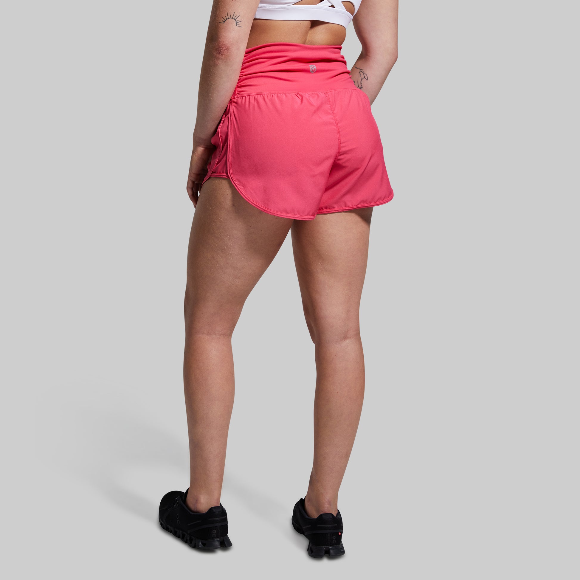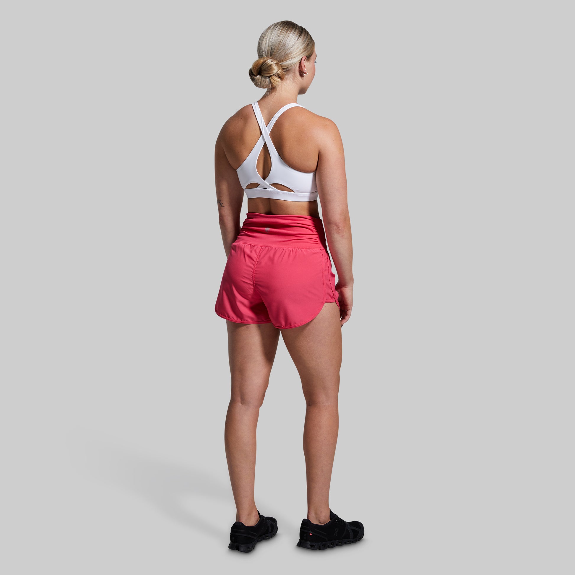 Designed with afternoon summer runs and sweaty box jumps in mind, our Elevation Short is a breathable and lightweight short to keep you cool when things start heating up. The flowy, loose-fitting leg opening combined with a stretchy compression waistband gives these women's bright pink high waisted running shorts the perfect balance of freedom of movement and stay-in-place reliability.